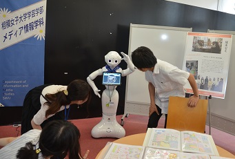 また今回は、終日にわたり2人のPepperがラウンジでの学科企画に登場しました。参加者は、胸のタッチパネルを生かしたメディア情報学科の紹介プログラムやダンス、写真撮影を楽しんでいました。また、メディア情報学科の学生が、Pepperの世話をしたり、デザインの授業やマンガに関する展示について参加者とお話していました。