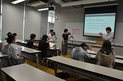 午後には非常勤講師の中嶋将平先生による模擬講義「声優になろう!恥ずかしくないよ、楽しいよ!」が開催され、参加した高校生と大学1年生が一緒に声優体験を行いました。皆さんラジオドラマの台本に沿って、上手に演技をされていました。