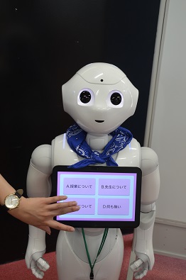 また今回は、終日にわたり2人のPepperがラウンジでの学科企画に登場しました。参加者は、胸のタッチパネルを生かしたメディア情報学科の紹介プログラムやダンス、写真撮影を楽しんでいました。また、メディア情報学科の学生が、Pepperの世話をしたり、デザインの授業やマンガに関する展示について参加者とお話していました。