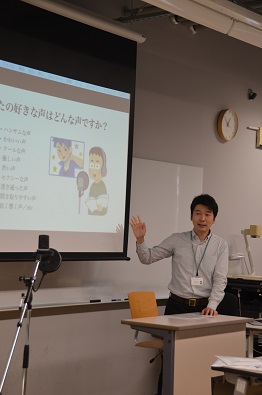午後には非常勤講師の中嶋将平先生による模擬講義「声優になろう!恥ずかしくないよ、楽しいよ!」が開催され、参加した高校生と大学1年生が一緒に声優体験を行いました。皆さんラジオドラマの台本に沿って、上手に演技をされていました。