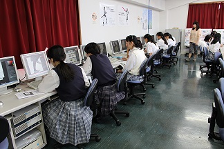 大学の情報処理教室で行われた授業では、メディア情報学科教員のサポートのもと、「情報」の教職課程を取っている学生が中心になって授業が行われました。高等部の生徒たちは普段と違った大学での授業であることや、年の近いメディアの学生が作業のサポートをしていることもあり、少し緊張しつつ、大変楽しそうに授業を受けていました。それぞれに大変ユニークな画像が出来上がりました。