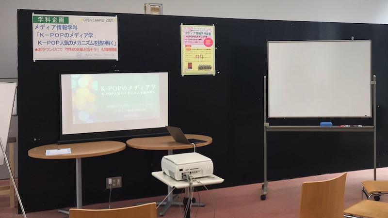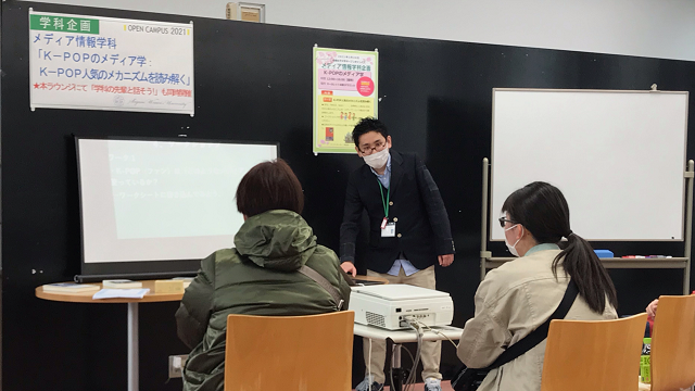 学科企画は「K-POPのメディア学:K-POP人気のメカニズムを読み解く」。アジアにとどまらず、世界的な人気を獲得しているK-POPの人気のメカニズムを「メディア」という視点から解き明かす、ワークショップ形式のイベントが行われました。