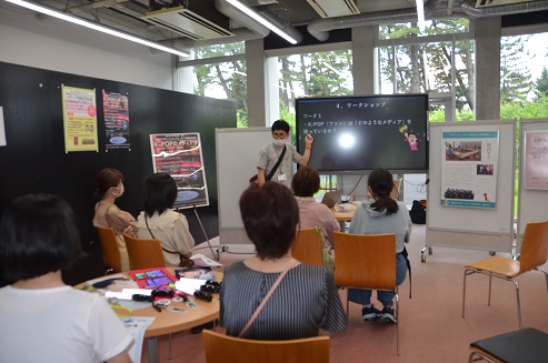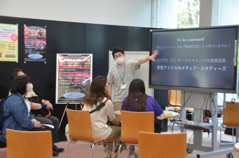 学科企画は「K-POPのメディア学 ver.2.0」。K-POPがなぜ人気を博しているのか、ファンとアイドルとの関わり方や日本のアイドルとの違いなどに触れ、考えるワークショップを行いました。参加した高校生や保護者の方の中にもK-POPが好きな方がいらっしゃり、在学生のファングッズなども展示される中、和気あいあいとした雰囲気で進められました。