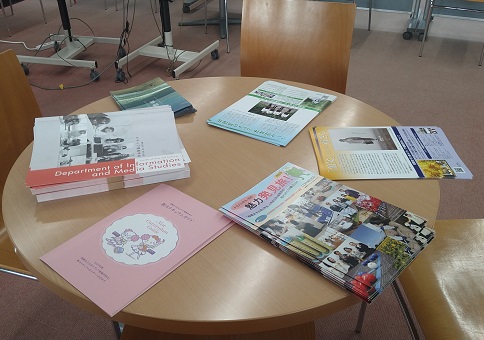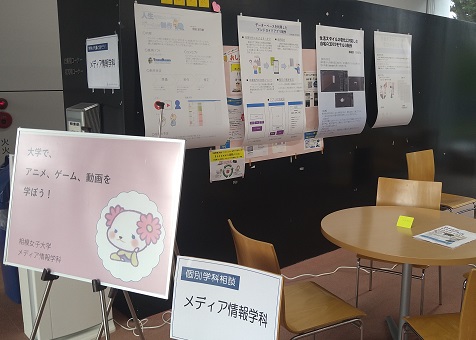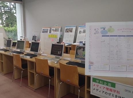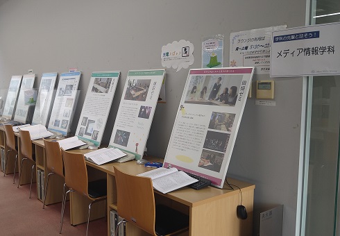 学科企画は「メディアのゼミを体験してみよう!」。メディア情報学科は、メディアに関する研究と制作の両方を学びの対象としています。そのため卒業論文では、メディアについて論じる卒業研究と、メディアを制作する卒業制作があります。今回は、卒業研究で執筆された論文や、卒業制作作品のゲームや授業中で制作されたアニメーションなどの展示を行いました。参加者の方に、直接ゲームをプレイしていただきました。