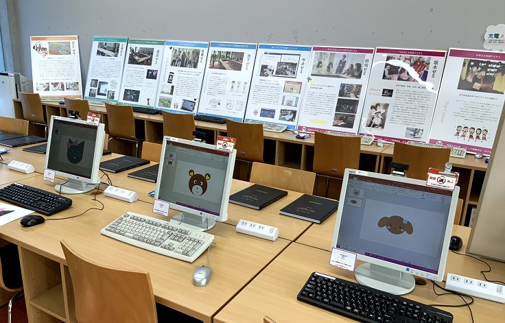 普段、メディア情報学科の授業で使っている教室で、Photoshopというソフトウェアを使ってフォトコラージュを行う実習を行いました。思い思いの作品を熱心に制作している様子でした。