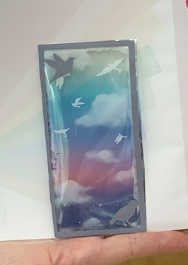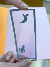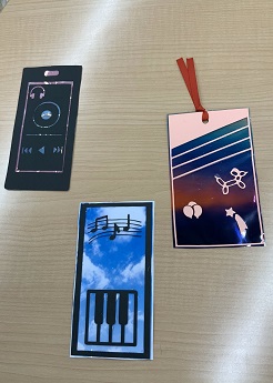 PowerPointというソフトウェアを使ってしおりの土台をデザインしていただき、カッティングマシンを使って画用紙をデザイン通りにカットしました。この紙に、セロファンやトレーシングペーパーなどを貼り付け、しおりを作っていただきました。