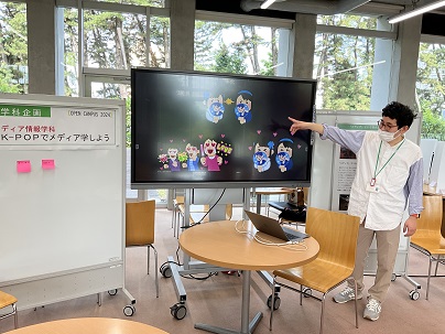 学科企画は「K-POPでメディア学しよう」。K-POPアイドルの人気の理由をメディアの視点から解き明かすワークショップを行いました。参加者の方には意見を付箋に書き込んでもらい、日本のアイドルとの違いなども考えながら参加していただきました。