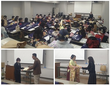 卒業式では、上級情報処理士・情報処理士の資格を取得した学生の中で成績が優秀だったメディア情報学科の卒業生2名に、全国大学実務教育協会の会長賞が授与されました。 また、優れた卒業研究を行った学生には発想賞が贈られました。メディア情報学科からは「ワークショップ-ソウゾウ- 子どもと美術作品につながる展覧会 企画提案」について研究した塚田瑠美さんが受賞しました。 式典終了後は場所を大学構内に移し、卒業証書・学位記授与が行われました。 ここでは卒業研究発表会で優れた発表を行った学生に、今年度新設されました優秀発表賞が贈られました。 「文化財におけるデジタルアーカイブとメタバース表現〜茜館を中心に〜 」について発表した毛塚真衣さん、 「イラスト集『こども』の制作」について発表した入江美帆さんが受賞しました。 ご卒業されたみなさま、おめでとうございます。
