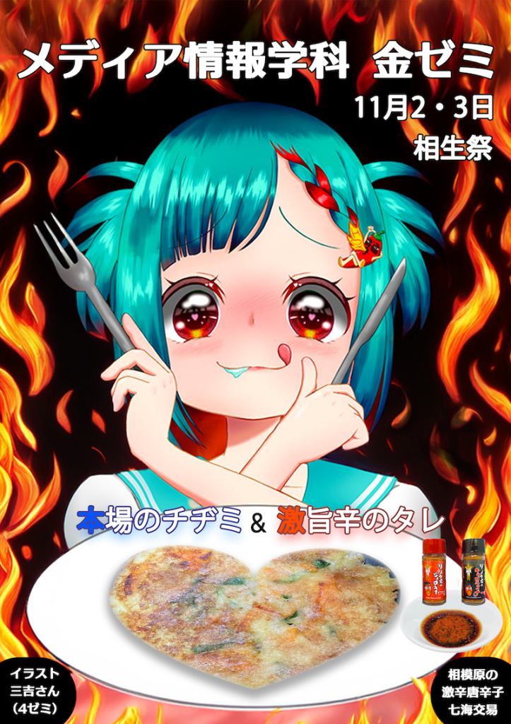 本学科の金先生とゼミ生がチヂミの模擬店を出し、本場の味を提供します。 チヂミに付けるタレには七海交易(代表:竹内僚さん)の世界一辛い唐辛子がかけられます。 七海交易は相模原市で激辛唐辛子の栽培と加工を行う会社で、地域連携に力を入れて模擬店にも全面協力しています。