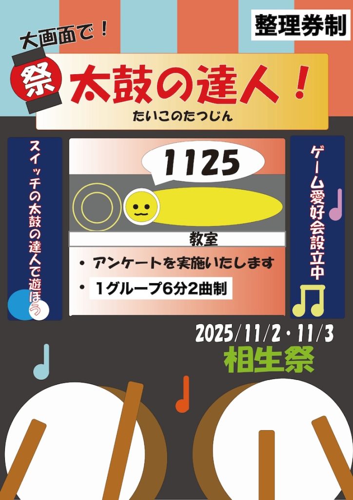 本学科の1年生が中心となり、ゲーム愛好会を設立するためにゲームイベントを開催します。 Switchの太鼓の達人をプレイしながら、愛好会を設立するために意見を集めます。 本学の関係者はもちろん、相生祭の来場者であれば誰もが参加できます。 特に本学を志望する学生や保護者の方々はぜひお越しください。
