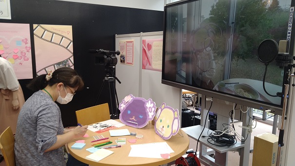 動画は、学科キャラクターのジョージョがメディアの学生となり、1日を過ごす中で大学やメディア情報学科の学び、キャンパスライフの紹介をするものです。今回のオープンキャンパスで初めて上映されました。会場では、実際に動画の制作に携わった学生が説明を行いました。